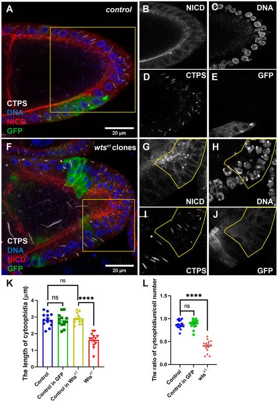 To investigate whether the wtsx1 mutation affects CTPS cytoophidia assembly in PFCs, we used antibodies targeting the NICD and CTPS for the immunostaining of egg chambers. In the control egg chambers, cytoophidia were observed in germline cells and follicle cells (Figure 2A,D). The NICD signal localized at the apical side of the follicle cells (Figure 2B), and a layer of follicle cells surrounded the germline cells (Figure 2C). In the wtsx1 egg chambers shown in Figure 2F, the accumulated NICD signal is framed by a yellow line (Figure 2G) to mark the wtsx1 PFCs, and the over-proliferative phenotype was observed, as shown with the yellow line (Figure 2H). We compared the length of cytoophidia in the NICD accumulation area with a normal area (Figure 2I). Comparing the GFP-positive clones, which had no accumulated NICD, with the GFP-negative clones, we found that the length of cytoophidia had no difference (data no shown) in the wtsx1 egg chambers. An analysis revealed that the length of cytoophidia in the accumulated NICD was shorter compared to the adjacent cells (Figure 2K). By counting the numbers of cytoophidia and follicle cells, we found that the proportion of cytoophidium in the accumulated NICD PFCs was decreased compared to other GFP-positive clones and GFP-negative clones (Figure 2L).