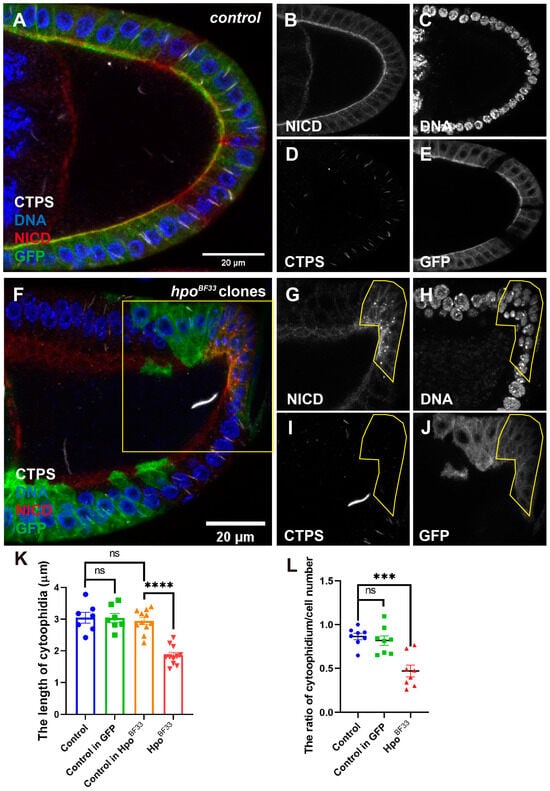 In the hpoBF33 egg chambers (Figure 3F), the accumulated NICD signal is framed by the yellow line in Figure 3G. The over-proliferative phenotype was also observed in the hpo-mutant PFCs (Figure 3H). Furthermore, during the quantification of the cytoophidia length, we observed that the hpoBF33 resulted in a decrease in the cytoophidium length in the NICD accumulation area (Figure 3I,K) compared with the cytoophidia in other follicle cells. Similarly, the proportion of cytoophidium in accumulated NICD PFCs was decreased compared to the other GFP-positive clones and GFP-negative clones (Figure 3L).