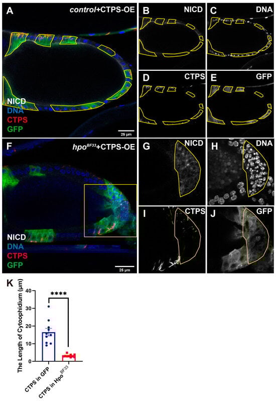 In hpoBF33 with CTPS overexpressed egg chambers (Figure 4F), the hpo mutant PFCs shown in 4G are framed by a yellow line based on the accumulated NICD signal. The over-proliferative phenotype was observed and is shown within the yellow line in Figure 4H. The cytoophidium length increased within the GFP-positive clones (Figure 4F,I). The GFP-positive follicle cells took hpo mutation and overexpressed CTPS (Figure 4J). Additionally, it is worth noting that the length of cytoophidia in the accumulated NICD clones was shorter than the that in the other GFP-positive clones (Figure 4I,K).