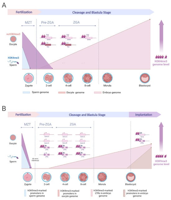 Epigenetic dynamics of H3K4me3 and H3K9me3 in early mouse embryogenesis. (A) H3K4me3 experiences swift depletion in the paternal genome post-fertilization, only to be reinstated during ZGA. Conversely, the deposition of ncH3K4me3 coincides with the silencing of the genome originating from fully grown oocytes and is subsequently substituted by canonical H3K4me3 at the 2-cell stage. Throughout ZGA, chromatin accessibility becomes evident at the H3K4me3-marked TSS sites of active genes. Simultaneously, transposable elements exhibit enrichment in H3K4me3. Progressing through development, there is a gradual escalation of H3K4me3 marks, culminating in forming a bivalent state with H3K27me3, priming the activation of developmental genes during the blastocyst stage. (B) Maternal genome-specific regions with H3K9me3 marks are more prevalent than paternal genome regions during early embryogenesis. The onset of early embryonic development triggers extensive DNA demethylation, resulting in the hypomethylation of actively transcribed regions, including LTRs. After fertilization, H3K9me3 marks within LTRs gradually increase during pre-implantation development. The majority of parental H3K9me3 regions are established de novo after fertilization. H3K9me3-enriched LTRs progressively emerge after the 4-cell stage and play a role in LTR silencing. Additionally, H3K9me3 marks in the promoters of developmental genes are erased after fertilization and restored after implantation. Abbreviations: LTRs, long terminal repeats; MZT, Maternal-to-zygotic transition; TEs, transposable elements; TSS, transcriptional start sites; ZGA, zygotic genome activation. Created with www.biorender.com (accessed on 25 December 2023).