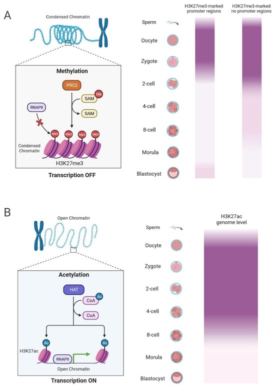 In stark contrast with H3K27m3, H3K27ac is generally associated with active transcription []. Catalyzed by histone acetyltransferases (HATs), adding acetyl groups to lysine 27 of histone H3 induces a more open chromatin structure, facilitating the binding of transcription factors and promoting gene expression (Figure 2B). As the zygotic genome undergoes activation, the presence of H3K27ac at specific genomic loci marks regions poised for transcriptional activity, a crucial indicator for the timely and precise expression of genes directing cell fate decisions and embryonic development [].