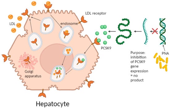 The role of the PCSK9 gene in lipid metabolism was discovered in 2003 [,,]. It was found that people who had a PCSK9 gene mutation resulting in its loss of function (LOF) exhibited a reduced risk of coronary disease due to the low blood LDL-C level []. Hepatic PCSK9 is a protein that regulates the half-life of LDLR in the liver. Typically, PCSK9 attaches to LDLR, and this process destines a simultaneous degradation of LDLR inside endosomes (Figure 1). This results in a reduction in the number of LDLR receptors on the hepatocyte surface, reducing uptake of LDL-C by the liver and, thus, the increase in the blood LDL cholesterol level [,,]. When PCSK9 is not present, LDLRs are abundantly available on hepatocytes’ surfaces and bind LDL on the surfaces of hepatocytes. This leads to the endosomal digestion of LDLs, but LDLR are able return to the cell surface and bind further LDL molecules, leading to a reduced level of LDL-C in the serum.