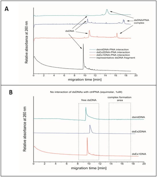 (A) Capillary electrophoresis analysis of interaction of PNA with its complementary DNA fragments. UV absorbance was measured at a wavelength of 260 nm. Absorbance intensities of DNA interactions with different complementary PNA fragments are depicted as green, blue, and red lines for InitPNA, Ex2PNA, and Ex1PNA, respectively. (B) Electropherograms of dsDNA fragments without addition of PNA.