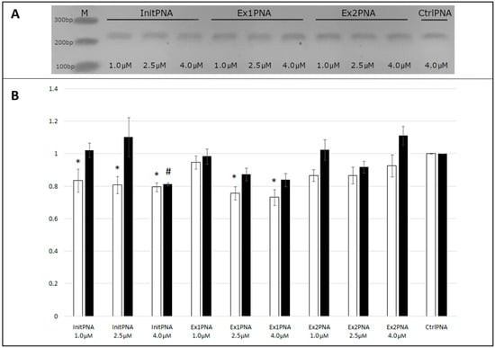 Integrated optical density (IOD) of DNA bands after conventional reverse transcription PCR (RT–PCR) (B) and agarose gel electrophoresis (A). An equal amount of RNA taken from the T7 RNA polymerase reaction served as a template. The control sample contained a PNA oligomer that was not complementary to the PCSK9 coding sequence. This sample was arbitrarily assigned a value of 100%. In Panel (B), dashed line bars represent real-time PCR, while white dotted black bars represent conventional PCR after 15 cycles, in comparison to the control PNA. *—p < 0.05 vs. ctrlPNA for RT-PCR, #—p < 0.05 vs. ctrlPNA for conventional PCR.