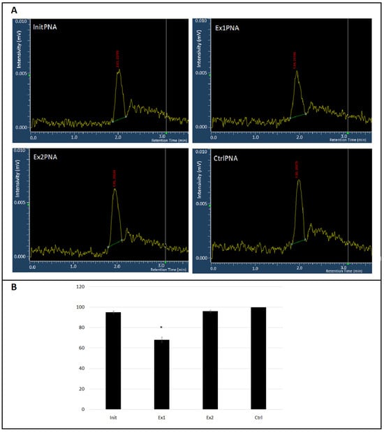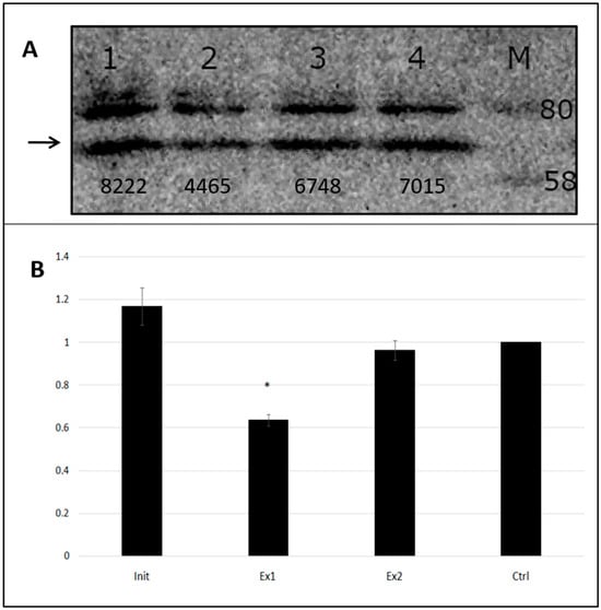 Western blot image of an in vitro transcription/translation reaction product resolved by electrophoresis with appropriate integrated optical density (I.O.D) values (A) and the relative amount of protein with respect to control sample (B). 1–4: Samples that contained InitPNA, Ex1PNA, Ex2PNA, and control (non-PCSK9 specific) PNA, respectively. M: Color Prestained Protein Standard, Broad Range (New England Biolabs, no. Cat. P7712). The PCSK9-specific band is depicted with an arrow. A total amount of 10 µg (25 µL sample volume) of purified products from the transcription/translation reaction was loaded onto the gel. The initial protein concentration in the samples was assessed spectrophotometrically. Measurements were made using ImageJ 1.53t software [,] *: p < 0.05 vs. control.