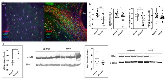 Canine VIC associated with MVP has myofibroblastic phenotype. (a) Representative immunohistochemistry images showing increased α-SMA (red) seen in MVP-affected valve (right) with # noting a myxoid structure compared to normal valve (left). DAPI (blue), phosphor-ERK (green). (b) Gene expression was measured by PCR showing VICs harvested from MVP/disease valves with lower Ct number (higher expression) of α-SMA, p21, TGFβR2, and TGFβ. n = 20 for disease/MVP group, and 17 for normal group. (c) Immunoblotting confirms increases in protein expression α-SMA in VICs harvested from MVP valves. n = 5 for disease/MVP group, and 4 for normal group. KLF4 protein expression normalized to β-actin was lower in diseased group but did not reach statistical significance. n = 3 for disease/MVP group, and 4 for normal group. •: normal VIC cell lines; ▪: MVP VIC cell lines. *: p < 0.05; **: p < 0.01; ***: p < 0.001. For normally distributed data: unpaired t-test, mean, and standard deviation shown; for non-normally distributed data: Mann–Whitney test, median, and interquartile range shown.