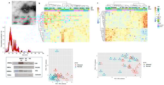 Cellular and sEV ncRNA profiles differ between normal and MVP-affected valves. (a) Small EVs collected from VICs showed expected cupped-shaped morphology under transmission electron microscopy (top), size distribution between 100–200 nm measured by nanoparticle tracking analysis (middle), and protein expressions positive for CD9, TSG101, Alix, and negative for calnexin as measured by immunoblotting (bottom). MDCK sEVs served as positive sEV protein control (CD9, TSG101, Alix), and VIC cellular protein served as positive control for cellular protein (calnexin). (b) Hierarchical clustering analysis (top) of cellular small ncRNA expression was analyzed against age and sex of the study dogs, showing clustering by disease group (normal vs. diseased). Each column represent individual study dogs, and each row represent a non-coding RNA species with padj < 0.05 Principal component analysis demonstrate the same clustering by disease group (bottom). (c) Hierarchical clustering (top) and principal component analysis (bottom) of sEV ncRNA.