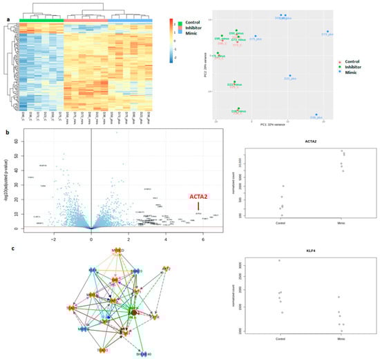 miR-145 upregulation results in increased α-SMA expression and decreased KLF4 expression. (a) Transfection of miR-145 mimic, inhibitor, and control miRNA into VICs (n = 6/group) showed distinct transcriptomic profiles on hierarchical clustering (left) and separation between groups on principal component analysis (right). The miR-145 inhibitor transfected cells have similar profiles as control miRNA transfected cells, while miR-145 mimic transfected profile is distinct from the other two groups. (b) Volcano plot (left) showed that miR-145 mimic transfected cells resulted in an upregulation of α-SMA (ACTA2, red arrow pointing at the data point for ACTA2) compared to control sample (padj = 4 × 10−11) (middle). (c) Ingenuity Pathway Analysis Upstream Regulator Analysis (left) identified 11 upregulated genes (orange) and four that are downregulated genes (blue) that could regulate α-SMA expression after miR-145 mimic transfection. KLF4 is one of the genes with decreased normalized count after mimic transfection compared to control (padj = 0.011) (right).