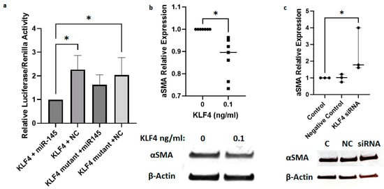 miR-145 directly targets KLF4 to suppress KLF4 expression. (a) Luciferase assay confirms targeting of KLF4 by miR-145. Assay was performed using HEK cells with control miRNA (NC). n = 3 wild-type and 3 mutant vectors; one-way ANOVA, mean, and standard deviation shown. (b) Immunoblot confirmed that VIC co-culture with KLF4 protein decreases α-SMA protein expression (n = 7/group; paired t-test, mean, and standard deviation shown), and (c) KLF4 siRNA treatment resulted in an increase in α-SMA protein expression. C: Control (vehicle only), NC: Negative control siRNA, siRNA: KLF4 siRNA (n = 3/group; Kruskal–Wallis test, median, and interquartile shown). *: p < 0.05.