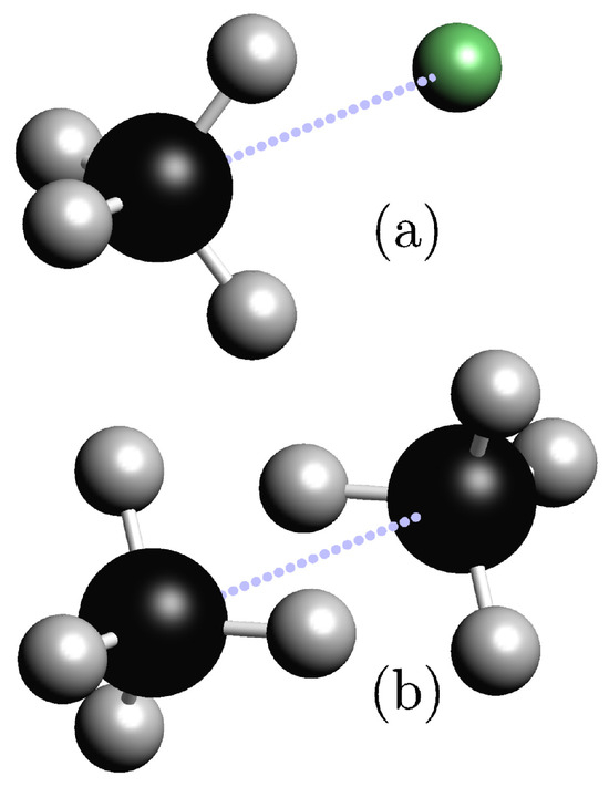 The main objects of study were a methane dimer in its D3d geometry [22,23] including an equilibrium one, a neon dimer, and a mixed methane-dimer complex, in which the equilibrium geometries (see Figure 1) were optimized within the same CCSD/basis set combination in which the 2-RDM was considered. Since the pair density calculations were carried out in only one geometry, characterized by quite large interfragment distances, we decided not to resort to the standard counterpoise correction procedure for the target correlation part of the 2-RDM values. The 2-RDM was constructed in coordinate representation for using the CCSD-RDM method with the basis sets cc-pVDZ, cc-pVTZ, and cc-pVDZ+bf[33221], in which the notation bf[33221] means the 3s3p2d2f1g basis on the dummy center recommended in reference [66]. The correlation energies of and were calculated using the same technique with the cc-pVDZ, cc-pVTZ, cc-pVDZ+bf[33221], and cc-pVTZ+bf[33221] basis sets. Moreover, to explore the pair density deficit behavior, due to the correlation in asymmetric cases, the related calculations for the VDZ quality basis set (CH4)⋯Ne were carried out for various geometric configurations. Finally, we addressed the influence of the bond functions’ dummy center on the interaction energies in all the mentioned complexes. To this end, the counterpoise-corrected energy dependences [28] on the interfragment distances measured as those between the non-hydrogen atoms were obtained for the cc-pVNZ+bf[33221] (N = D, T, Q) bases with various choices for the dummy center position, and the complete basis set extrapolation was performed [67].