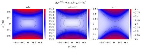 Since the main bulk of the correlation-related specifics of the pair density dependence comes down to the lines of the electron–electron coalescence, a reasonable way to approach the problem of adjusting the bond function basis set starts from an analysis of the diagonal part of the pair density function , on which the most salient minima induced via the correlation should be revealed. This observation was partially confirmed by an inspection of the intermolecular electronic correlation in dispersion-bounded systems such as dimers of noble gases or alkanes [21,30,32,44,45,46]. While the minima points of would be the first approximation for a place where the bond functions should be centered, the related characteristic exponents and angular momenta of these additional functions can be partially recovered from the relevant angular behavior and radial slopes of this function.