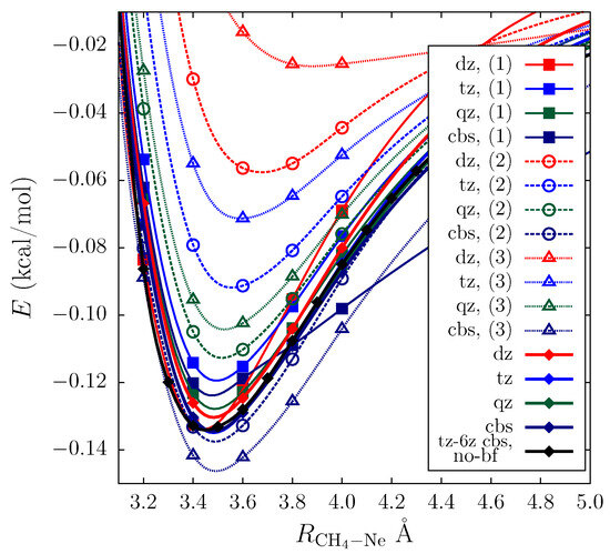 In order to assess the role of the bond functions centering on the quality of the CCSD description for the intermolecular correlation and the extent to which the assumed choice of the pair density minimum is relevant for this, we performed a number of calculations for the counterpoise-corrected interaction energy depends on the interfragment distance of the methane and neon dimers, as well as the methane–neon complex, according to the procedure described in Section 2.2.2. The CCSD calculations were carried out with the aug-cc-pVNZ (N = D, T, Q) bases, followed by the CBS extrapolation with the bond functions located at various selected positions, including the pair density minimum point recovered using the aug-cc-pVDZ basis. The benchmark data were obtained in a similar way using the aug-cc-pVNZ (N = D, T, Q, 5, 6) basis set series without the bond functions with subsequent CBS extrapolation.