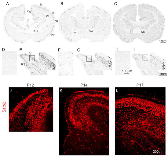 To study the neurogenesis of the cerebral cortex and anterior commissure, opossums of different ages were injected with bromodeoxyuridine (BrdU), a marker for DNA synthesis. Several studies reported that BrdU, when injected into pregnant laboratory rodents (mice or rats), can be toxic for embryos, inducing cell death in specific brain areas or producing a decrease in body and brain masses [19,20]. Additionally, in our previous study, all pups from each litter were injected on the same day [6]. We found that the upper-layer IV started to form at P12 [17]. Comparing the body masses of different litters of intact pups on a selected day, we found significant differences between the body masses of opossum pups from different litters on the same day of development. For example, at P17, the average mass of opossum pups from different litters varied by as much as 50% (0.97 ± 0.06 g vs. 1.6 ± 0.08 g). However, we were unable to weigh the opossum pups after the injection of BrdU because the pups touch their mother’s teat until they are four weeks old. During this period, removing the pup and touching the mother’s teat again is impossible. Therefore, here, opossum pups from each litter were injected on three different days (P12, P14, and P17), and BrdU-labeled cells were detected at P90. Our results showed that at P12, neurogenesis occurred in the upper layers of the cerebral cortex (Figure 1A,E). According to the cortical developmental gradients, visual areas developed later than the somatosensory or motor cortical areas placed in the posterior part of the brain (Figure 1A–C). At P12, the enhanced generation of visual neocortical neurons occurred in layers II–IV (Figure 1E), while the production of anterior neocortical neurons was observed only in layers II/III or II (Figure 1A). In particular, in the cingulate and somatosensory cortex, BrdU-labeled cells were located inclusively in the upper layer II (Figure 1A). This indicates that neurogenesis in the upper layers started one or two days earlier. At this age, BrdU-labeled cells were almost absent in the anterior commissure (Figure 1A,D). At P14, in the anterior part of the neocortex, neurons were mostly induced in layers II (Figure 1B); meanwhile, in the posterior part of the visual areas, BrdU-labeled cells were located in layers II–IV (Figure 1G). In the 17-day-old opossums, BrdU-labeled cells were detected only in the upper layer II of the visual area (Figure 1C,I). A few BrdU-labeled cells appeared in the anterior commissure at P12 (Figure 1A,D), and their number increased as the opossums developed (Figure 1B,C,F,H).