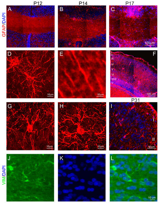 In marsupials, the formation of the anterior commissure is linked to the generation of neocortical neurons, whose axons project into the anterior commissure and cross its midline region to form interhemispheric connections. We found that the anterior commissure connecting the brain’s two cerebral hemispheres was visualized in DAPI-stained brain sections at P12 in the opossums (Figure 3A). DAPI is a marker for the nucleus of all types of cells. This structure gradually became thicker with brain development, as shown in a 14-day-old (Figure 3B) and a 17-day-old opossum (Figure 3C). During this developmental period, cells of the midline region of the anterior commissure expressed GFAP. The morphology of some GFAP-labeled cells indicated that these were not radial glial cells (Figure 3A–C). Consistent with other studies [27,28], we observed typical radial glial cells in the cortex (Figure 3E,F), which were characterized by long radial glial processes and their somata being placed in the ventricular zone (Figure 3F). These cells were progenitor cells that gave rise to neurons and glial cells. In the cerebral cortex, astrogliogenesis occurs later, mainly at the end of the formation of cortical layers [29]. There are two types of astrocytes, namely protoplasmic and fibrous. Protoplasmic astrocytes have short, thick, and more branch processes, while fibrous astrocytes have long, thin, and a few processes [30]. We found both protoplasmic and fibrous astrocytes in the cerebral cortex at P31 in the opossums (Figure 3G,H). Interestingly, we detected astrocytes that were GFAP+ in the midline of the anterior commissure of the developing opossum (Figure 3D). Additional immunostaining was performed using vimentin, a commonly used astrocyte marker. Our results revealed that vimentin-positive cells were present in the midline region of the anterior commissure (Figure 3J–L).