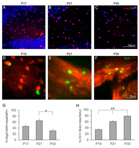 Development of oligodendrocytes in opossums. (A–C) Olig2 (red) and DAPI (blue) immunostaining in the anterior commissure of opossums at P17 (A), P21 (B) and P30 (C). (D–F) BrdU (green) and CC1 (red) immunolabeled cells in brain sections presenting the anterior commissure in opossums at P19 (D), P21 (E) and P30 (F). (G,H) Percentage of cells colocalizing Olig2 and DAPI (G) or BrdU and CC1 (H) expressed as mean ± SEM. * p = 0.02, ** p < 0.0001. The scale bar in (C), and (F) refers to (A,B), and (D,E), respectively.