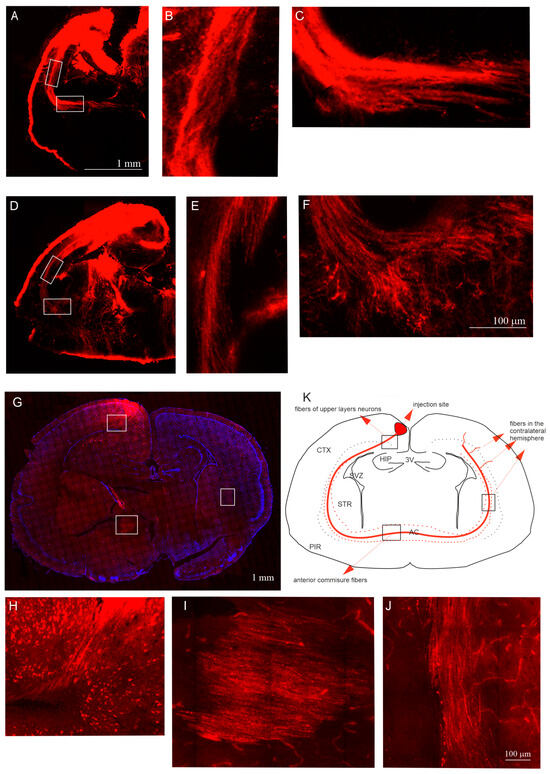 To achieve precise injections of the tracer into the upper cortical layers of opossums’ neocortex, a virus was injected into the upper cortical layers of 30-day-old animal brains. We applied a virus carrying information about the mCherry red fluorescent protein expressed in excitatory cells, showing the presence of CaMKII (Ca2+/calmodulin complex kinase). The virus injections revealed that the axons of mCherry-expressing neurons from the upper layers II/III were visible just below the deeper cortical layers, along the surface of the thalamus (Figure 6G,H). These axons reached homotopic and heterotopic neocortical areas of the contralateral hemisphere through the anterior commissure (Figure 6G,I,J).