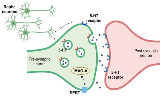 Simplified 5-HT release and metabolism. 5-HT is synthesized by pre-synaptic raphe neurons. After synthesis, 5-HT is transported into vesicles for storage. Upon vesicle fusion with the plasma membrane, 5-HT is released, where it interacts with 5-HT autoreceptors located on the releasing cell or 5-HT heteroreceptors, located on post-synaptic neurons of other regions. The serotonin transporter (SERT) transports 5-HT back into the releasing cell, where it is likely to be repackaged for release by or degraded by monoamine oxidase A (MAO-A).