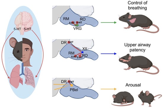 - Hodges, M.R.; Richerson, G.B. Contributions of 5-HT Neurons to Respiratory Control: Neuromodulatory and Trophic Effects. Respir. Physiol. Neurobiol. 2008, 164, 222–232. [Google Scholar] [CrossRef] [PubMed]