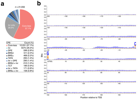 Percentages of Inr were approximately 45–60% in early studies [18,55,57], while those in recent studies by Vo ngoc et al. and Vanaja and Yella were 40.0% for the focused 7678 promoters [19] and 36.5% for 16,398 promoters [27], respectively; we calculated it to be 31.2% for 21,056 promoters (Supplementary Table S2). The data of Vo ngoc et al. originated from their focused TSSs, which were determined by the 5′-GRO-seq method. Therefore, their percentages cannot be compared with those of Vanaja and Yella or this study. The difference between the values 36.5% and 31.2% was presumed to be primarily due to the difference in the extent of allowance for position deviation, for which Vanaja and Yella allowed a 10 bp deviation from the precisely defined position of −3 to +3 but we allowed a 5 bp deviation.