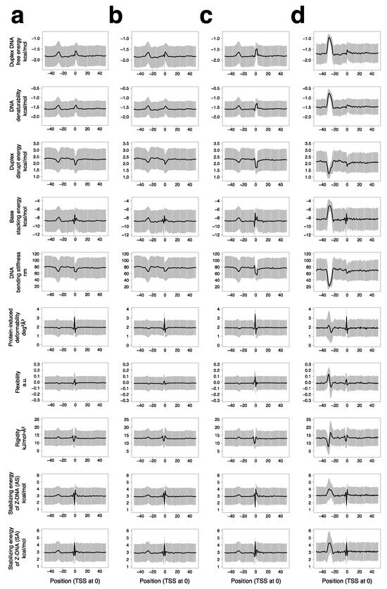 Core-less promoters have no consensus sequences. However, Fukue et al. showed that when they were aligned at the TSS, their average flexibility and rigidity profiles demonstrated distinctive features around the TSS [21]. To update the data and prepare the basis for subsequent analyses targeting individual promoters, we prepared the average profiles for 10 DNA physical properties (DPPs) of human Pol II promoter groups, including all 21,056 promoters (Figure 2a), 12,031 core-less promoters (Figure 2b), 6559 Inr-containing promoters (Figure 2c), and 533 TATA-containing promoters (Figure 2d). The calculation involved a sliding window of 10 bp and a moving step of 1 bp (see Section 4). For the groups of the unsorted promoters and core-less promoters, we recently reported their average profiles for duplex DNA free energy, base stacking energy, protein-induced deformability, rigidity, and stabilizing energy of Z-DNA(AS) [20]. The analysis used small fractions of promoter samples (~1/7 of the entire population) obtained by random sampling. Thus, here we performed full-scale analyses again. As shown in Figure 2a,b, there was no difference in the corresponding profiles between the unsorted promoter and core-less promoter groups. Although the population of Inr-containing promoters was not necessarily small, did not generate bias in the DPPs. This can be understood from the profiles shown in Figure 2c. The DPP profiles of the Inr-containing promoters were similar to those of the core-less promoters. TATA-containing promoters showed average DPP profiles (Figure 2d) similar to those shown in Figure 2a–c. However, their distinctiveness in DPPs was highly accentuated at positions approximating −27.