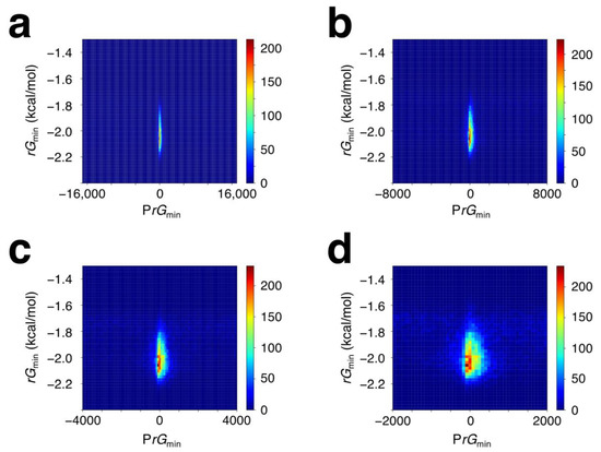 We hypothesized that two built-in marks of significantly different sizes might be embedded in the genome to indicate the TSS position of a gene or to act as two functional units that allow transcription initiation; one unit is a comparatively large energetic mark of approximately 150–200 bp (a nucleosomal or promoter DNA size), and the other is a distinctive DPP comprising several bps around the TSS or position −27. Regarding the latter, we hereafter use the singular expression “second built-in mark”. Furthermore, we presumed the free energy of the duplex DNA to be the first marker, as it influences nucleosome occupancy [51]. To substantiate this hypothesis, we first examined whether promoters or promoter-containing wide regions show common energetic features in the human genome. The free energy values for the calculations were based on those reported by Sugimoto et al. [42]. Targeting the TSS-centered 32, 16, 8, and 4 kb sequences, each spectrum of the duplex DNA free energy of a given sequence was calculated with a sliding window of 151 bp and a moving step of 1 bp. The lowest values of the duplex DNA free energy in the target sequence and its position were designated as rGmin and PrGmin, respectively. These two variables exhibited significant relationships (Figure 3). Despite analyses of considerably wide regions, the data points converged within ±300 bp of the TSS.