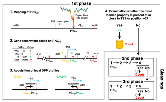 The distinctive DPPs of several bps around the TSS and position −27, as indicated in Figure 2, are the second strongest built-in mark in our hypothesis. However, again, the question of the proportion of individual genes that have such DPPs around the TSS and/or position −27 remained. To determine this, we used the procedure shown in Figure 4. Briefly, in the first phase, all individual 21,056 (all human Pol II genes) or 12,031 (human Pol II genes with a core-less promoter) genes were subjected to four steps of analysis. First, PrGmin was mapped between −4 kb and +4 kb from the TSS of a given gene (step 1). Then, based on the positional relationship between the TSS and PrGmin, the gene was sorted (step 2). If it belonged to group II (PrGmin; between −300 and 0) or III (PrGmin; between +1 and +300), it was subjected to the next step (step 3), and if not, it was treated as a sample in the second-phase analyses. In step 3, the profiles of 10 DPPs of a 300 bp region illustrated in the figure were obtained. Finally, if the gene had the most significant property at or close to its TSS or position −27 for any of the 10 properties, it was considered a positive sample (step 4). However, if it did not, it was subjected to the second-phase analyses, which employed a new PrGmin, named PrGmin′ (see Section 4). The third-phase analyses were a repetition of the preceding phase analyses; however, they used PrGmin″, a newer PrGmin.