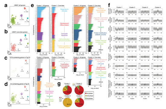 The analysis of individual promoters strongly suggested that the second built-in mark plays a role in most human Pol II promoters. The next issue to be examined was whether we could classify genes via the detailed features of the two built-in marks. To obtain the answer, a uniform manifold approximation and projection (UMAP) dimension reduction method based on Riemannian geometry and algebraic topology [52] and density-based spatial clustering of applications with noise (DBSCAN) clustering method [53] were applied to 15,604 and 9032 detected genes, respectively (Table 1; the sum of the counts in all phase analyses for all genes and that for genes with a core-less promoter). UMAP is a widely used manifold learning technique. Compared with t-SNE, it is considered to preserve the local and the global data structure more with only a short run time [52]. Thus, it is frequently applied to many genomic studies. DBSCAN is also widely used. This clustering method can group data with similar density into one cluster. Our analysis revealed that the detected genes were separated into four clusters for all genes and genes with a core-less promoter (Figure 5a,b). The distribution of genes with a TATA-containing promoter is shown in Figure 5c; most of these genes were included in cluster 1 of Figure 5a. However, the percentage in cluster 1 was only about 11.8%. In contrast, Figure 5d indicates that the genes with an Inr-containing promoter were almost evenly included in all four clusters.