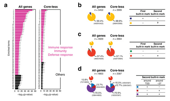 The screening shown in Figure 4 could not detect 5452 and 2999 genes among all genes and genes with a core-less promoter, respectively. These groups of genes were subjected to GO term analysis in the BP category, which yielded notable findings. They mostly belonged to the category of primary response genes (PRGs) [54], among which those involved in the immune response were significantly enriched (Figure 6a and Supplementary Figure S2). Notably, 90.4% of the 5452 genes (=4929 genes) and 88.8% of the 2999 genes (=2664 genes) had their TSSs outside of the PrGmin, PrGmin′, and PrGmin″ territories (Figure 6b). A majority of the genes in the two groups did not have these regional energy marks. However, 97.4% of the 4929 genes (=4800 genes) and 97.1% of the 2664 genes (=2587 genes) had the most distinctive DPPs around the TSS and/or position −27, i.e., the second built-in mark (Figure 6c). In addition, 70.5% (3384/4800) and 70.9% (1833/2587) were found by the distinctive DPPs around both the TSS and position −27 (Figure 6d). Notably, considering the data on the detected 10,452 (all genes) and 6007 genes (genes with a core-less promoter), among which 67.0% (10,452/15,604) and 66.5% (6007/9032) have distinctive DPPs around both sites, respectively, they indicate that 65.7% ((10,452 + 3384)/21,056) of all human Pol II promoters and 65.2% ((6007 + 1833)/12,031) of core-less promoters have such distinctive properties around both sites; various pairs of DPPs are usually involved in this phenomenon.