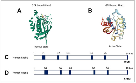 Crystal Structure of Rheb1: (A) The crystal structures of Rheb1 bound with GDP (Inactive State) and (B) Rheb1 bound with GTP (Active State) were aligned. (C) Rheb1 protein, with a length of 184 amino acids, is represented with the approximate locations of the G-boxes 1–5 and CSVM (CAAX motif) [23]. (D) Rheb2 protein, with a length of 183 amino acids, is represented by the approximate locations of the G-boxes 1–5 and CHLM (CAAX motif) [23]. Crystal structures are from the Protein Data Bank (PDB ID: 1XTQ, 1XTS).