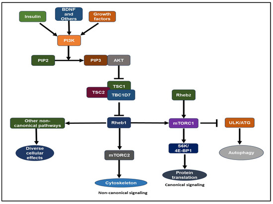 The TSC complex-Rheb1-mTORC1 pathway is known to influence neuronal architecture and function, and TSC neurological symptoms are, at least in part, owing to changes in cell-autonomous synapse function. Excitatory spine dysmorphogenesis and lower spine synapse density have recently been discovered in TSC neurons of rodent models [86,95]. Independent of mTORC1 activation, Rheb1-syntenin signaling modulates activity-dependent learning and memory processes. Rheb1-GDP binds to syntenin and causes proteasomal breakdown, allowing proper spine production for learning and memory. However, in TSC mutant neurons, Rheb1 remains GTP bound, preventing it from binding to syntenin, resulting in syntenin accumulation and disrupting the link between syndecan-2 and calcium/calmodulin-dependent serine protein kinase. For appropriate spine growth, these proteins must be linked together. As a result, Rheb1 inhibits the establishment of spine synapses in TSC models, resulting in dendritic spine abnormalities [95].