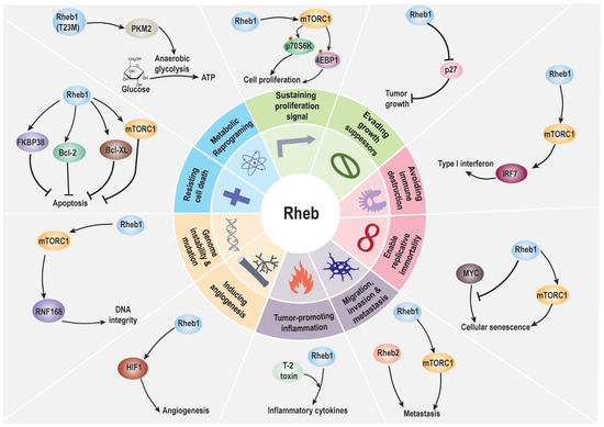 So far, ten characteristics have been identified as the hallmarks of cancer [142,143]. Moreover, Rheb1 regulates many neuronal activities via mTOR, a protein well-known for being involved in cancer hallmarks. Rheb1’s influence on these hallmarks suggests it could be a potential target for anticancer treatments (Figure 4). Understanding how Rheb1 affects cancer provides insight into its potential role in the pathway leading to tumor formation.