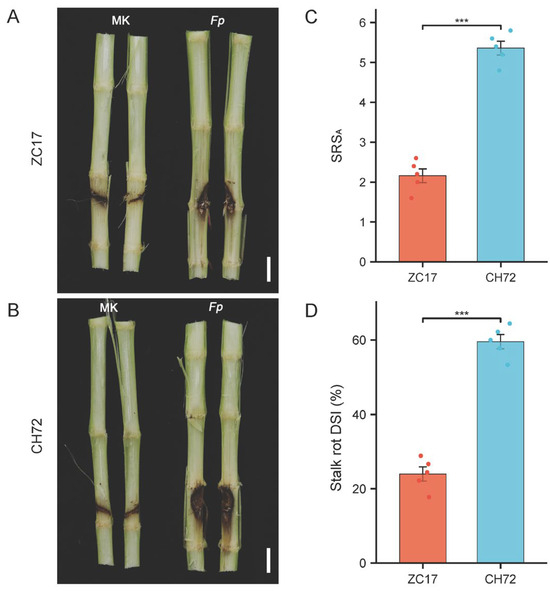 As described previously, we inoculated maize inbred lines CH72 and ZC17 at leaf nine. At 7 days post inoculation, the inoculated internodes were divided to observe in detail the F. proliferatum infestation and the appearance of stalk symptoms among the different groups. Obviously, compared with the mock-inoculation group, the F. proliferatum inoculation group showed obvious symptoms in the stalks, with brown areas in the upper and lower nodes of the inoculation site and darker areas closer to the wound location. More than half of the inoculated nodes showed typical dark brown symptoms, and even the lesion tissues in the vicinity of the wounds had completely collapsed and decayed (Figure 1). The inoculated group of samples from the resistant inbred line ZC17 showed significantly lower lesion areas and symptoms than those of the sensitive inbred line CH72 (Figure 1A,B). The SRSA and DSI of the ZC17 and CH72 stalks were consistent with the symptom phenotypes: the susceptible inbred CH72 had approximately 2.48-fold more SRSAs than the resistant inbred ZC17 line (Figure 1C), and its DSI increased by 35.36% compared to that of ZC17 (Figure 1D).