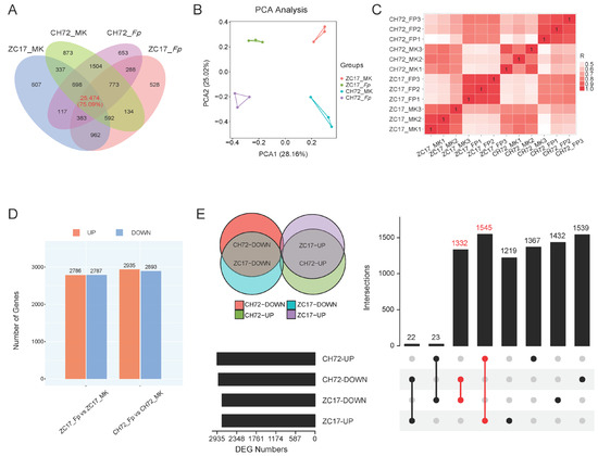 Analysis of transcriptome sequencing data. (A) Venn diagram of the number of expressed genes in the four groups of samples. (B) Principal component analysis (PCA) based on gene expression profiles for the four groups of samples. (C) Heatmap of the correlation of gene expression for all samples. (D) Histograms of the number of up- and down-regulated DEGs in the F. proliferatum-inoculated group compared to the mock-inoculated group in the two inbred lines. (E) The Upset plot demonstrates the DEGs that were jointly up-regulated and jointly down-regulated in the two inbred lines (ZC17 and CH72) after F. proliferatum inoculation.