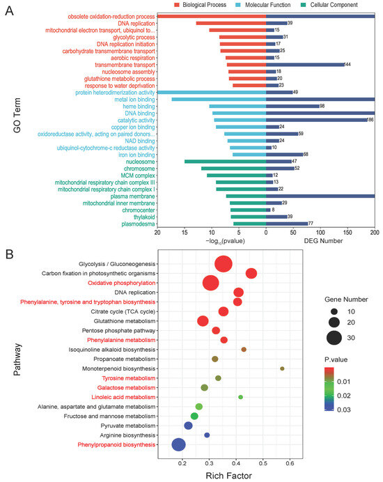 The GO and KEGG enrichment analyses of DEGs. (A) A histogram of the GO enrichment analysis with the top 10 entries with the smallest p-value selected for each Biological Process (BP), Cellular Component (CC), and Molecular Function (MF). The left bar is −log(p-value) and the right bar is the number of DEGs for the corresponding entry. (B) A bubble diagram of the KEGG enrichment analysis of differential genes. Pathways colored in red are closely related to plant disease resistance.