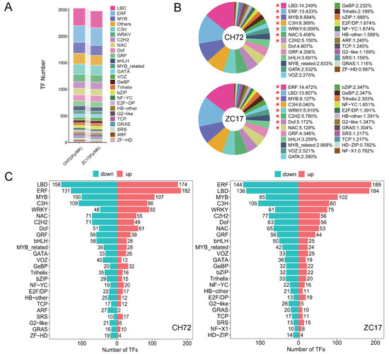 Analysis of transcription factors. (A) A bar-stacked plot of the top 25 TF families with the highest numbers in ZC17 and CH72. (B) The top 25 TF families with the highest numbers in ZC17 and CH72 and their percentages are illustrated in this circular graph. Those marked with “*” indicate TF families with more than 5% in each of the two inbred lines. (C) The bar graph shows the number of up- and down-regulations in the top 25 TF families. Blue indicates down-regulation and red indicates up-regulation.