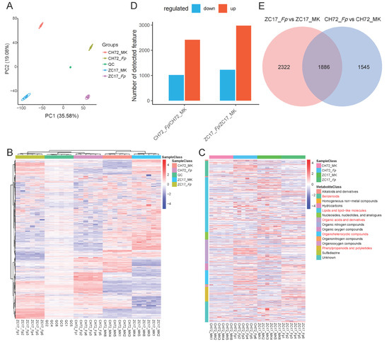 Next, we analyzed the identified metabolic features for significant differences and, in this study, we used a univariate analysis of the multiplicity of differences (fold-change) and t-test, combined with the variable important for the projection (VIP) value obtained by the multivariate statistical analysis PLS-DA, when screening for DEMs. The differentially expressed features satisfy the following three conditions at the same time: (1) a ratio ≥ 2 or ratio ≤ 1/2; (2) p value < 0.05; and (3) VIP ≥ 1. In CH72 (Fp vs. MK), 2415 and 1016 metabolic features were significantly up- and down-regulated, respectively. Correspondingly, in ZC17 (Fp vs. MK), the numbers of significantly up- and down-regulated metabolite features were 2980 and 1228, respectively (Figure 5D). A total of 1886 significantly different metabolic features were common to both comparison groups. The number of significantly different metabolite features that appeared in ZC17 (Fp vs. MK) or CH72 (Fp vs. MK) alone was 2322 and 1545, respectively (Figure 5E).