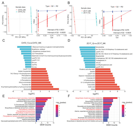 Differential metabolite analysis and functional enrichment. The PLS-DA analysis and the validation analysis of the permutation test in CH72 (A) and ZC17 (B). Histograms of the top 10 metabolites with the largest fold change in terms of up- and down-regulated differences in CH72 (C) and ZC17 (D). The KEGG pathway enrichment analysis bar graphs showed the top 10 pathways that were most significantly enriched (with the smallest p-value) in CH72 (E) and ZC17 (F), respectively, in reverse order of the number of DEMs.
