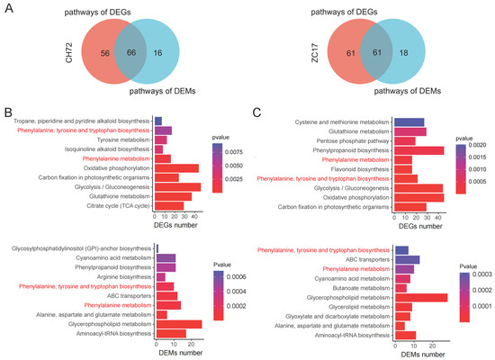 Integrated analysis of the transcriptome and metabolome. (A) Pathways involved in differential genes and differential metabolites in CH72 and ZC17 were intersected by Venn diagrams. The top 10 pathways that were most significantly enriched in each of the differential genes and differential metabolites among the pathways that intersect CH72 (B) and ZC17 (C) are shown as bar graphs. There are two pathways labeled in red that are co-enriched in the four pathway enrichment bar graphs.