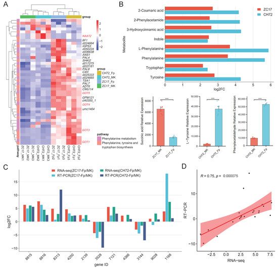 Further analysis of the phenylalanine, tyrosine, and tryptophan biosynthesis and phenylalanine metabolism pathways and their qPCR validation. (A) Heatmap of the clustering of DEGs involved in the phenylalanine, tyrosine, and tryptophan biosynthesis and phenylalanine metabolism pathways. DEGs involved in both pathways are marked in red. (B) Bar graphs and histograms of the expression trends of DEMs in these two pathways in ZC17 and CH72. The symbol “***” indicates significant differences (p < 0.001, n = 6) between two groups, based on Student’s t-test. (C) Histogram of the fold change of DEGs in transcriptome sequencing and qPCR results. (D) Spearman rank correlation analysis showed high concordance between the RNA-seq and qPCR results.