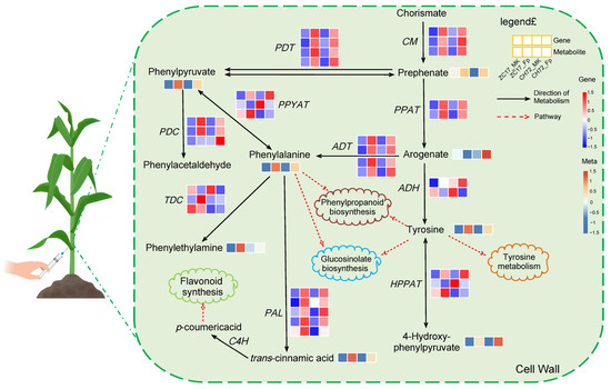 The schematic diagram of key genes and metabolites in the phenylalanine metabolic pathway involved in maize the response to F. proliferatum. CM, chorismate mutase; PDT, prephenate dehydratase; PPAT, prephenate aminotransferase; ADH, arogenate dehydrogenase; HPPAT, 4-hydroxyphenylpyruvate aminotransferase; ADT, arogenate dehydratase; PPYAT, phenylpyruvate aminotransferase; PDC, p-coumaric acid decarboxylase; TDC, tyrosine decarboxylase; PAL, phenylalanine ammonia lyase; C4H, cinnamate 4-hydroxylase.