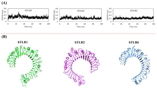 (A) RMSD plot after applying 100 ns MD simulation, confirming equilibration and structural optimization. (B) Optimized structures of bovine TLR1, TLR2, and TLR6 obtained through homology modeling followed by 100 ns MD simulation.