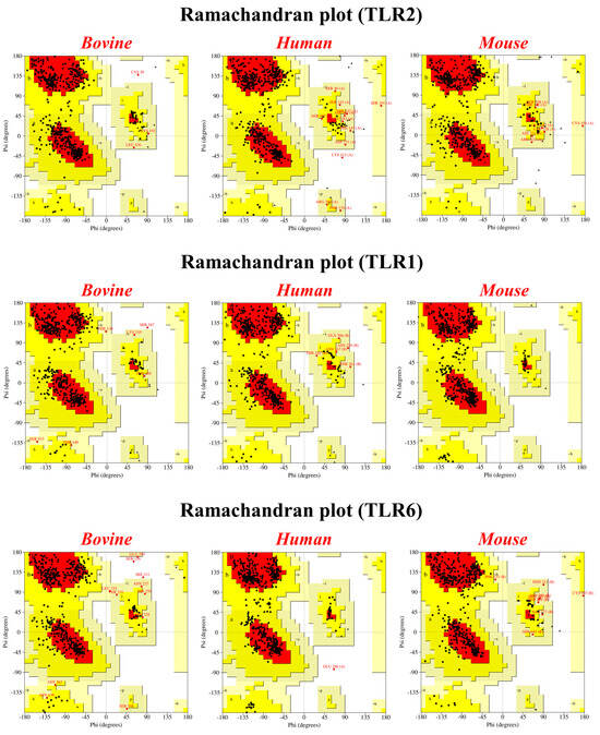 Ramachandran plot depicting the structural integrity of bovine, human, and mouse TLRs. The majority of residues fall within the allowed regions. Red (A, B, L), yellow (a, b, l, p) and pale yellow (~a, ~b, ~l, ~p) indicate the most favored, allowed and generously allowed regions, respectively. White color represents the disallowed regions.