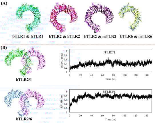 (A) Structural alignment of optimized bovine TLRs with their experimentally crystallized human and mouse counterparts. (B) Optimized bovine TLR2/1 and TLR2/6 heterodimers after applying 150 ns MD simulation. RMSD plots confirm the equilibration and the structural optimization.