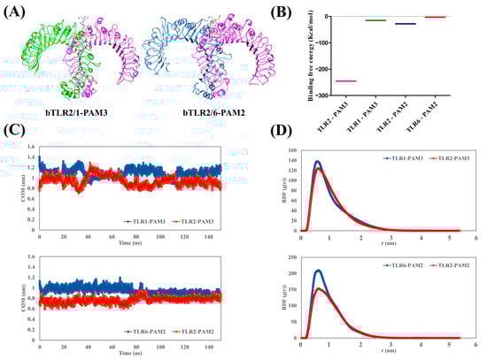 (A) Optimized structures of bovine TLR2/1-PAM3 and bTLR2/6-PAM2 after applying 150 ns MD simulation. (B) Binding free energy calculated for PAM3 and PAM2 with the main binding site of TLRs in the last 10 ns of MD simulation using MM/PBSA approach. (C) Center of mass (COM) analysis for PAM3 and PAM2 with the main binding sites of TLRs, demonstrating strong affinity. (D) Radial distribution function (RDF) of PAM3 and PAM2 with the main binding site of TLRs during MD simulation, confirming COM result with a peak at 0.5 nm.