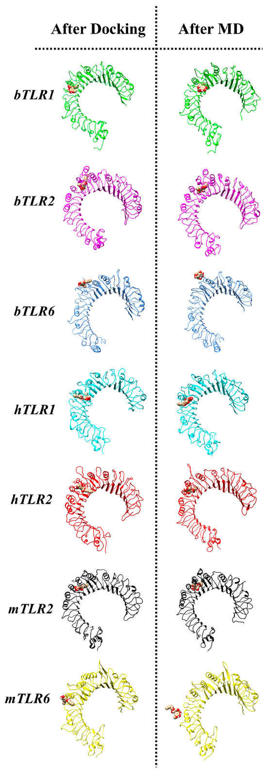 TLR2 is associated with inflammation, apoptosis, and angiogenesis in various pathophysiological conditions in cattle (i.e., mastitis, endometritis, and enteritis) [20,21,22,23]. Quite recently, we reported the physiological function of TLR2 heterodimerization in the bovine uterus and the formation of the TLR2/1 dimer, but not TLR2/6, in response to sperm [6] via experimental and computational studies. In our previous investigations, we employed modeled modeling to construct the protein structure specific to bovine species [6]. Within this study, we identified the first predicted binding pockets in TLR1, TLR2, and TLR6 that were consistently located in the same positions across bovines, humans, and mice. Furthermore, it was revealed that the physicochemical characteristics of these pockets exhibited high similarities among all species. From these findings, we concluded that the process of dimerization is likely similar in humans, mice, and bovines [6]. However, the mechanism of interaction between agonists and antagonists with the main binding site of bovine TLRs remains unknown.