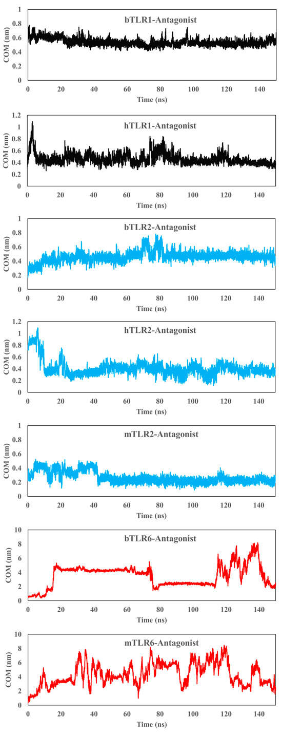 Initially, the antagonist was docked to the main binding site of the TLRs using dimeric and monomeric forms, and then a 150 ns simulation was conducted. The antagonist effectively binds to the main binding site of TLR1 and TLR2 in their monomeric forms and fails to bind to TLR6 across all three species (Figure 6). Furthermore, the COM analysis affirms a strong affinity between the antagonist and TLR1 and TLR2 (Figure 7). For instance, in the case of TLR1, the COM starts at approximately 0.5 nm (in the initial docking structure), and the antagonist maintains this position over the simulation time. Similarly, for TLR2 in all species, the variation in COM is minimal and reaches a stability state around 0.4 nm after approximately 40 ns. On the other hand, there is an absence of interaction between the antagonist and the main binding site of bovine and human TLR6, with a sharp increase in the COM plot after 20 ns.