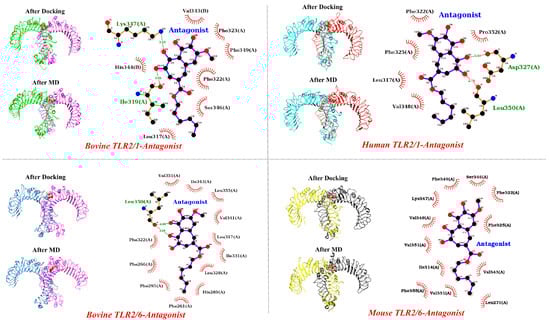 In light of the unknown pre-formed TLR2 dimeric forms, our study assessed the antagonist’s effect on TLRs in both monomeric and dimeric states. Computational analyses unequivocally revealed that TLR2 antagonists effectively penetrate the main binding site of TLR2 across the human, mouse, and bovine species. Consequently, they obstruct and occupy this critical site and interfere with the dimerization process in the presence of agonists. Interestingly, the antagonist exhibits a blocking effect on TLR1 in both human and bovine models. However, our data did not indicate any interaction between the antagonist and the main binding site of TLR6. In dimeric forms, it becomes evident that antagonists exhibit a noticeable affinity for the main binding site of TLR2 across all species, surpassing their interaction with TLR1 and TLR6. This suggests that CU-CPT22 is able to antagonize TLR2 activation by both agonists (PAM3 and PAM2). Similar to our findings, Grabowski et al. demonstrated that CU-CPT22 robustly suppresses human TLR2/6 and mouse TLR2/1 via experimental and computational studies [31].