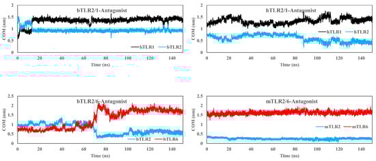 Center of mass (COM) plot for the main antagonist (CU-CPT22) and the main binding site of TLRs in dimeric forms. The data clearly indicate a strong interaction between the antagonist and the main binding sites of TLR2. However, for TLR1 and TLR6, the antagonist cannot remain at the main binding site and instead occupies the main binding site of TLR2.