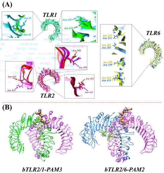 (A) Asn residues equivalent to those glycosylated in human and mouse TLRs, with corresponding Asn residues in bovine TLRs. (B) Optimized structures of bovine TLR2/1-PAM3 and TLR2/6-PAM2 after applying MD simulation. The TLR proteins were glycosylated at equivalent Asn residues based on human and mouse TLR glycosylated structures.