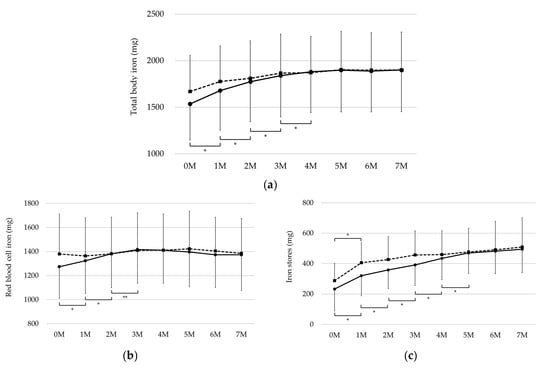 To address these issues, researchers have used total body iron (TBI) as an index of in vivo iron levels. TBI is the sum of the iron stores, while RBC iron calculated from Hb, serum ferritin, and soluble transferrin receptor levels. When patients receive iron replacement therapy to treat iron-deficiency anemia, they first experience an improvement in the Hb level, followed by a replenishment of iron stores. Estimating the in vivo iron level using Hb or serum ferritin alone would be challenging, but both parameters are reflected in the TBI value, making it suitable for ascertaining the approximate amount of iron in vivo. An increase in the TBI level is considered to reflect the absorption of iron during oral iron replacement therapy, and TBI has been used in a number of studies [,,,]. Cable et al. investigated iron kinetics in blood donors and demonstrated the efficacy of orally administered iron [], while Bialkowski et al. reported similar efficacy in patients receiving iron orally at 19 mg or 38 mg []. Furthermore, Cable et al. were able to calculate iron stores by using only the serum ferritin level, which are collected as part of patients’ regular care, without using soluble transferrin receptor levels [].